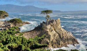 Da Carmel parte la “17 Mile Drive” una strada scenografica che da Pacific Grove scende a Pebble Beach dove è situato un famoso campo da golf. Lungo la strada si attraversano foreste di cipressi che digradano verso il mare. Il percorso prosegue lungo il mare e sulle rocce, poco distanti dalla riva, ammiriamo gruppi di foche con i loro piccoli. Noi abbiamo percorso questo tratto con il mare in tempesta e le onde gigantesche ed era uno spettacolo veramente emozionante. La strada è anche caratterizzata dai cipressi che sfidano il vento impetuoso che è quasi sempre presente in questo tratto, ma il cipresso più famoso e più fotografato della California è il “Lone Cypress Tree” che si erge solitario su una scogliera a picco sul mare.