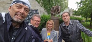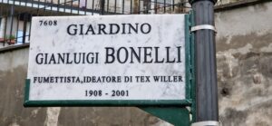 Per concludere la giornata, e per la gioia di di Gabriele, ci rechiamo in Via Mac Mahon nei giardini dedicati al fumettista Gianluigi Bonelli ad ammirare la scultura in bronzo che raffigura Tex Willer ed il suo cavallo preferito Dinamite. La scultura è stata donata al Comune dalla famiglia Bonelli. Davanti a Tex, Gabriele ed Edward si fanno una bella chiacchierata e Gabriele da grande e appassionato collezionista dei suoi fumetti è felice di poter parlare del suo eroe preferito. Concludiamo così la prima giornata di riprese, domani ci aspettano altri interessanti luoghi da visitare.